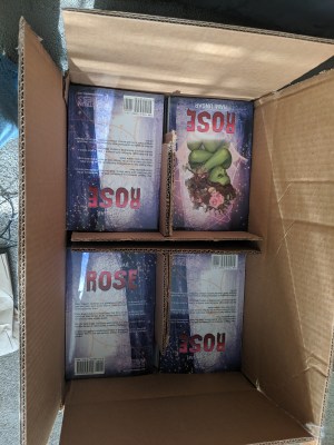In the meantime, let’s talk about why you clicked on this post: today, the author copies of Rose I ordered arrived. Yeah, about forty copies of the book, all in one giant box that my rental managers warned me might be too heavy to carry and that I might need a shopping cart to get it to my building. Turns out, it was just heavy enough to give my arms a workout while carrying it, so I wasn’t in too much pain.