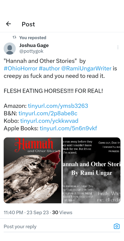 Anyway, if you’re looking for something good to read this Halloween, you can’t go wrong with Hannah. I’ll include links below so you can check it out. And if you read it, I hope you’ll leave a review online. After all, I love reader feedback, positive or negative. And your reviews help other readers whether or not to check out the book.