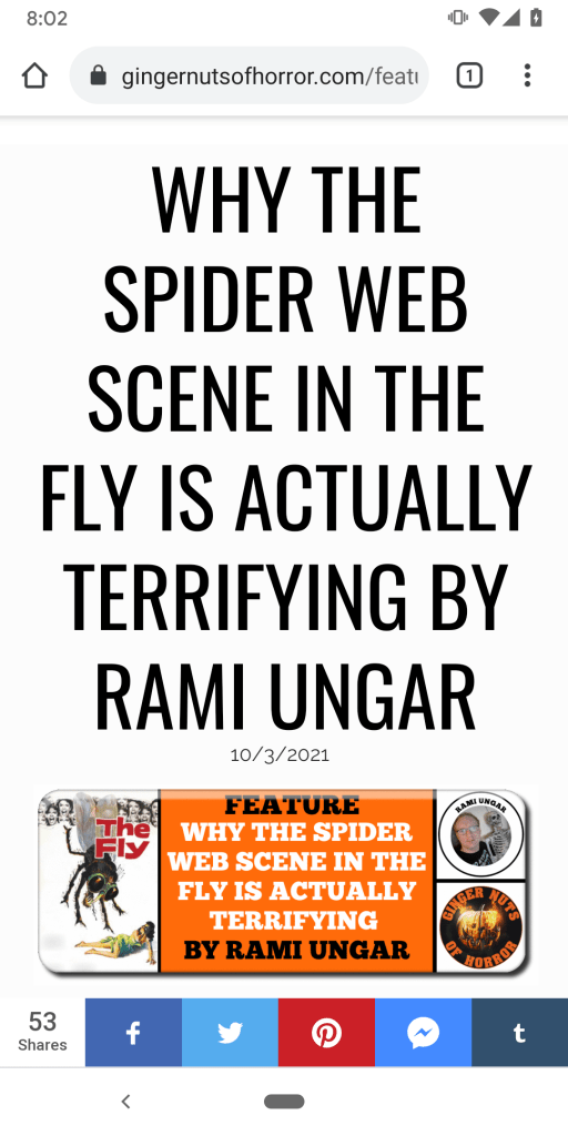 This led to me writing my article, “Why the Spider Web Scene in The Fly is Actually Terrifying.” As you can tell from the title, I break down why that scene is so terrifying element by element. It’s a bit longer than some of my blog posts, about fifteen hundred words, but I think you’ll find it worth the read. I’ll include the link below. At least, nearly a hundred people have shared the article across social media since the article went live this morning, if that’s any metric.