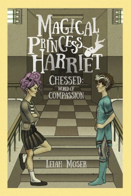 The girl on the cover with the lavender hair and the dark holes where her eyes ought to be is Kasadya. She looks like that because she’s one of the nephilim, a group of creatures who got their start as angels unwilling to devote their existences to service. As a nephil-girl, she has the power to influence human minds, and she has used this ability to turn the middle school into her own private domain… well, private except for her brother Azrael, that is, but as far as she’s concerned she is the one in charge. Kasadya likes to think of herself as an epic villain from a TV show or comic book, and she’s been waiting for a hero to come along to challenge her. When Harriet shows up, glowing like a disco ball, it occurs to Kasadya that she might fit the bill — much to Harriet’s chagrin.