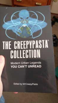 While I had to end my acquaintance with the genre rather abruptly (job searching and then landing a busy full-time job, as well as trying to write my own stories, doesn’t leave that much time for perusing the Internet for horror stories), I never forgot about this strange world of creators making and sharing these scary stories, sharing characters and creating entire mythologies out of some of them (Slender Man, anyone?). So when I found out there was actually a couple of anthologies of creepypasta available in book format, which meant I could read them on my lunch break, I decided to get a copy and dive in to see back in.