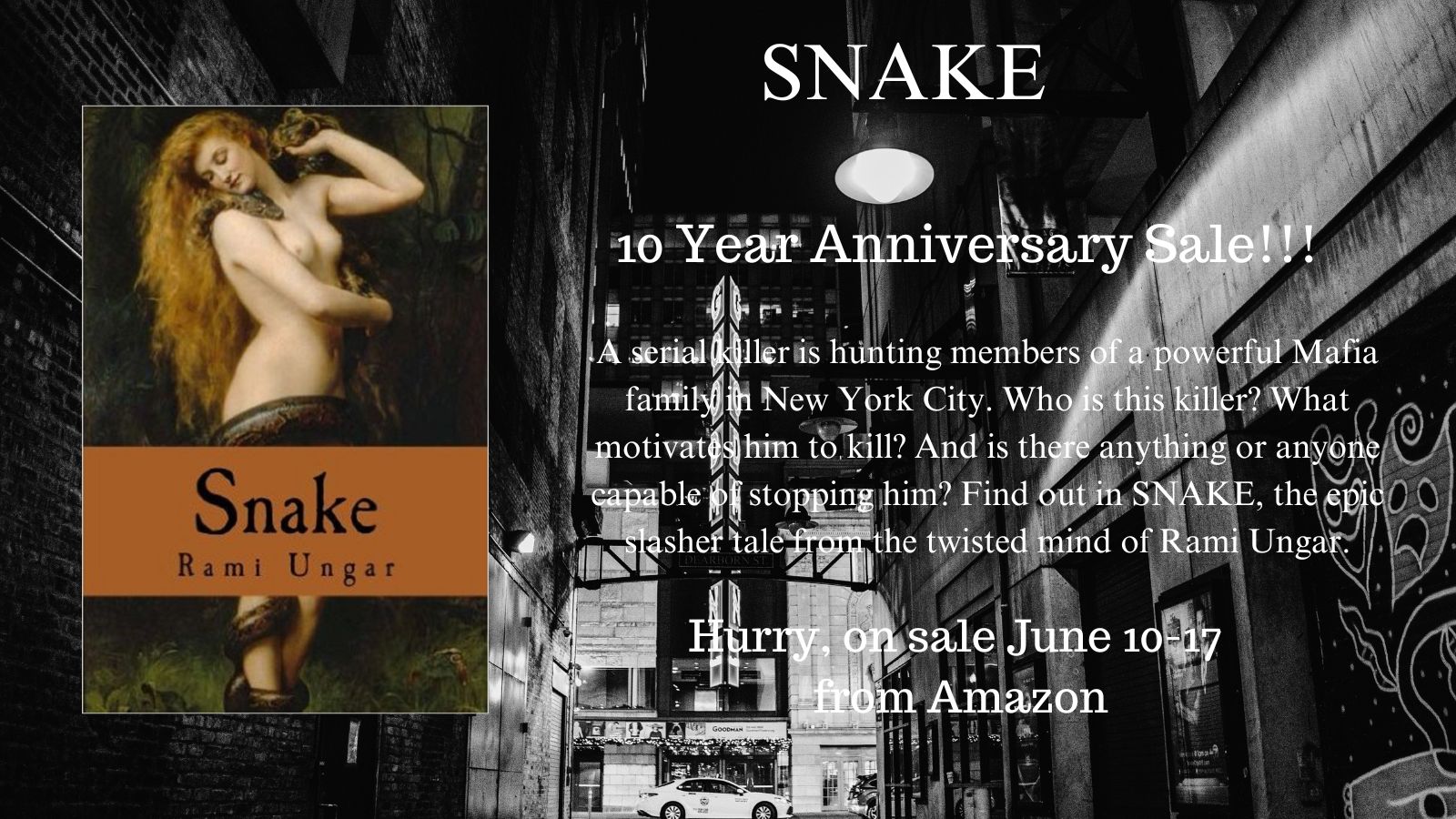 Also, in the meantime, if you’re interested, my novel Snake is celebrating its ten-year anniversary. This one is a slasher, and follows a serial killer hunting mobsters in New York City. Think John Wick, Taken and Friday the 13th got smashed into a novel together. The sale for Snake is going through Monday, June 17, so why not grab a copy? I’ll leave the links below.
