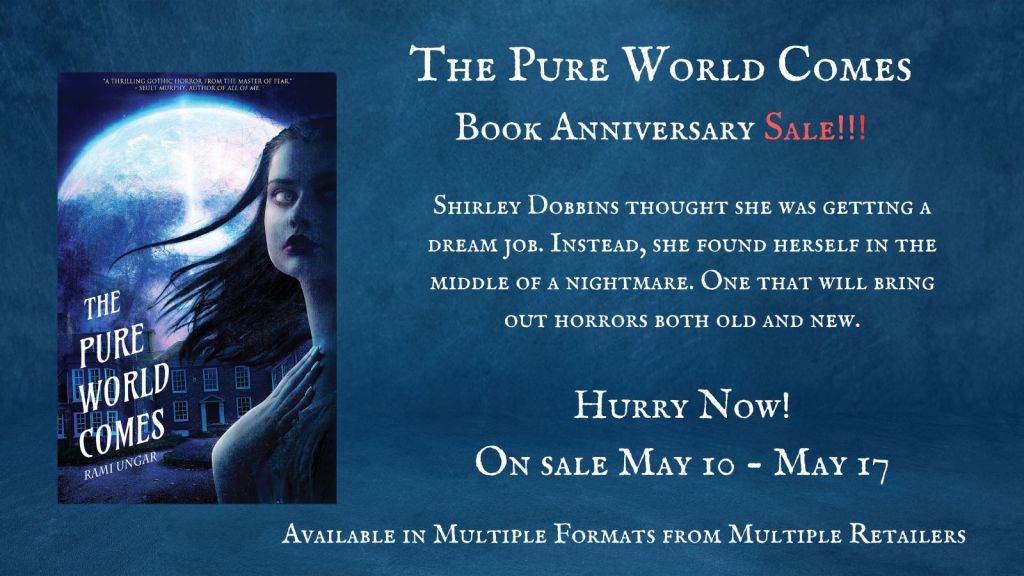 Anyway, to celebrate the two year anniversary of The Pure World Comes releasing, I’m doing a sale! From today, May 10, through May 17, the book will be on sale in multiple formats from multiple retailers. Even the audio book will be on sale from select stores (I can only do sales on the audio book from Spotify, B&N, Apple and Chirp)!