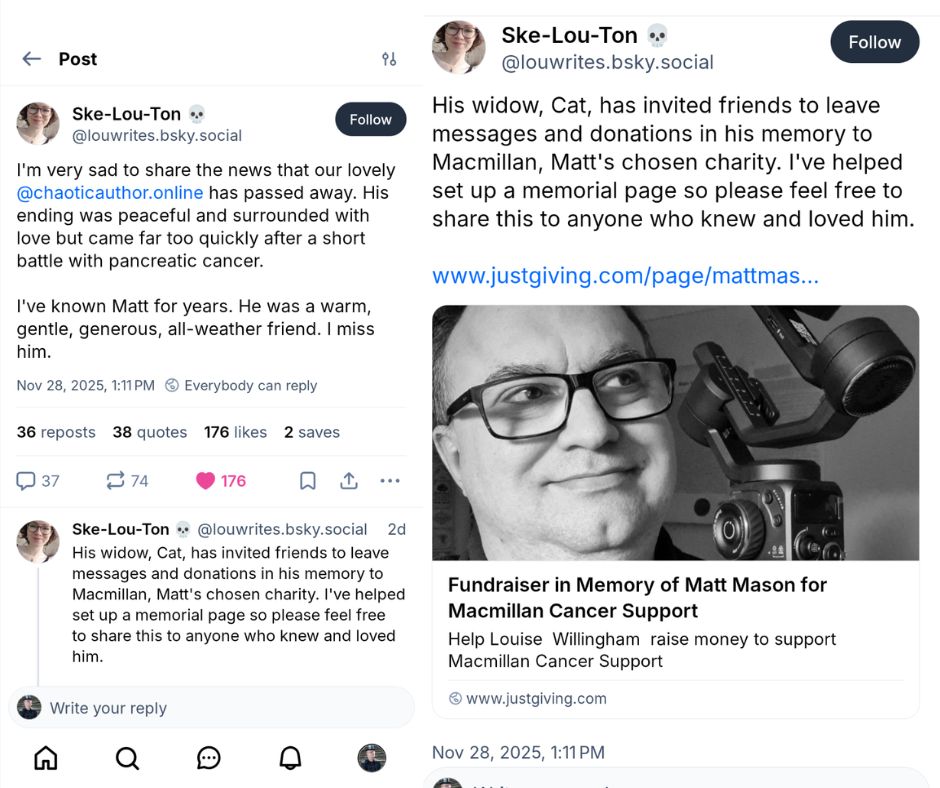 I’m talking about Matt today because he passed away this past week. A few months he revealed that he was battling cancer and that it looked to be terminal. We were all devastated to hear that, and we sent him our well-wishes, hoping he could get better. And while he didn’t respond to all of our messages, he did continue to interact online with us when he could. But yesterday, he passed away.