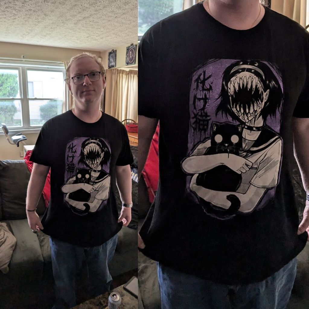So yeah, I got my wild Florida story. Maybe, at 31, I got it a bit later than other people do, but damn, was it fun and unpredictable and I got some souvenirs out of it (including the utterly creepy tee from the mall’s Hot Topic that I’m wearing below). Whether or I not get a story out of any of it, I don’t know (though the idea of a Florida trip gone wrong is fertile ground for a horror story).