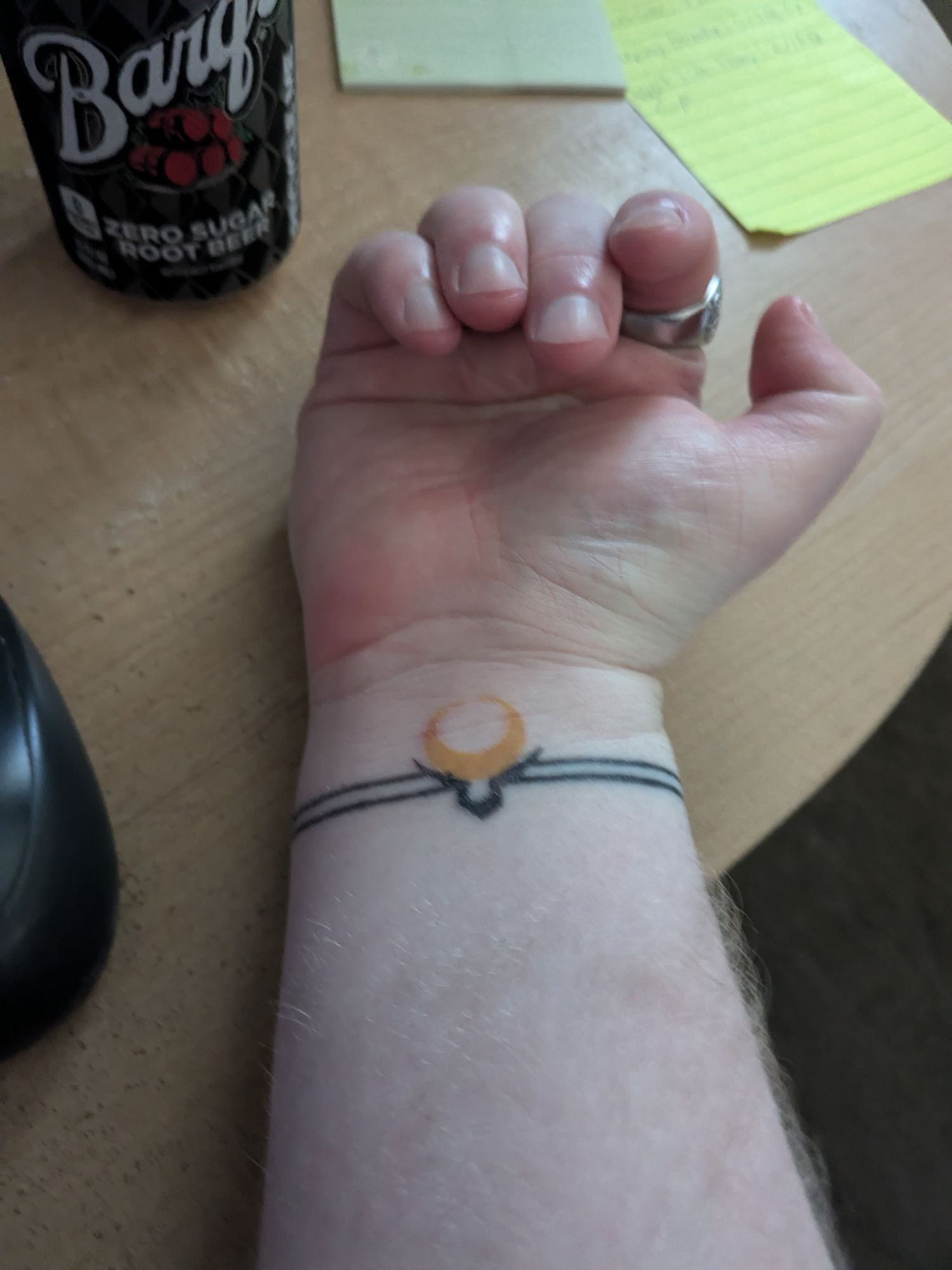 Yeah, bet you didn’t see that coming. Still, going to Florida and returning with a tattoo from a local shop does feel like something that would happen on a wild Florida trip. And I’m quite satisfied with the result. The two symbols are from two anime I’m quite fond of, with two bands around my wrist like a bracelet.